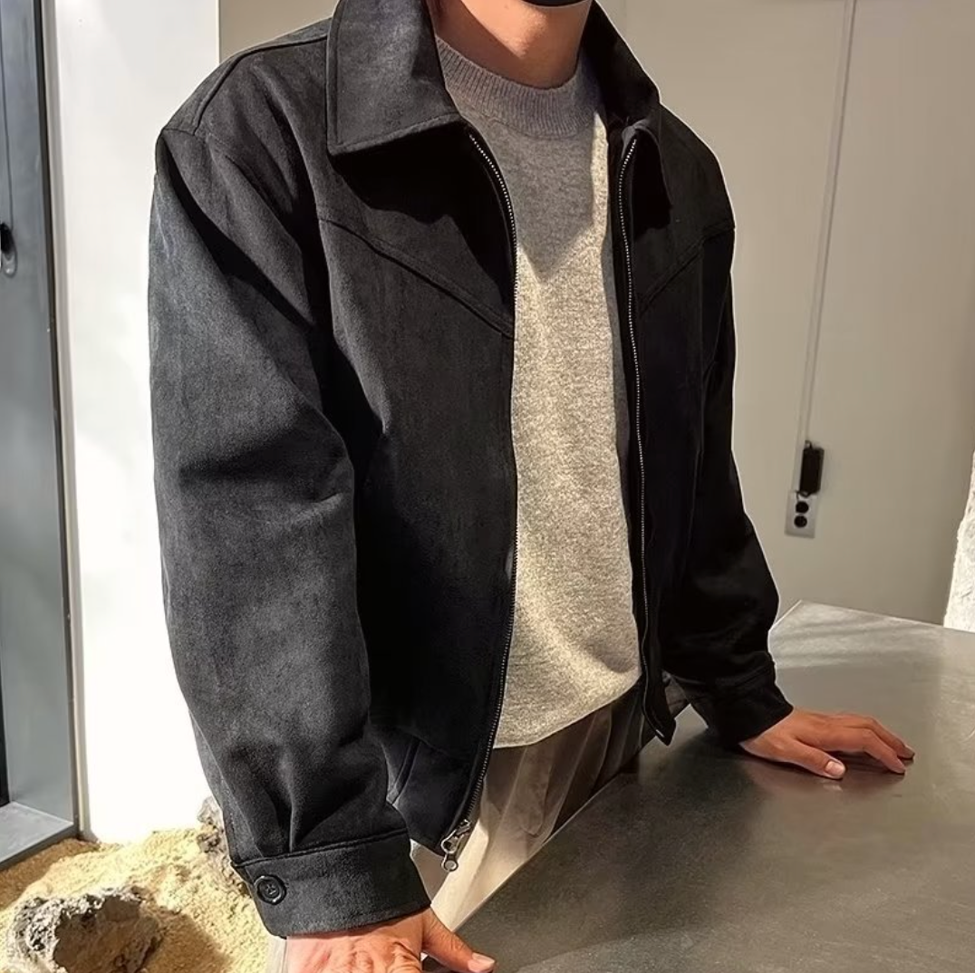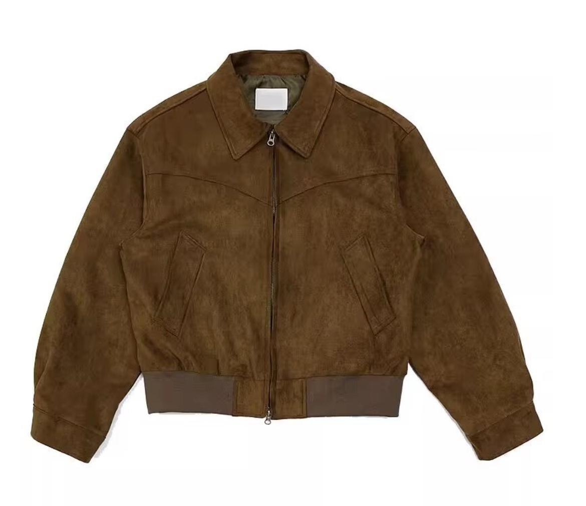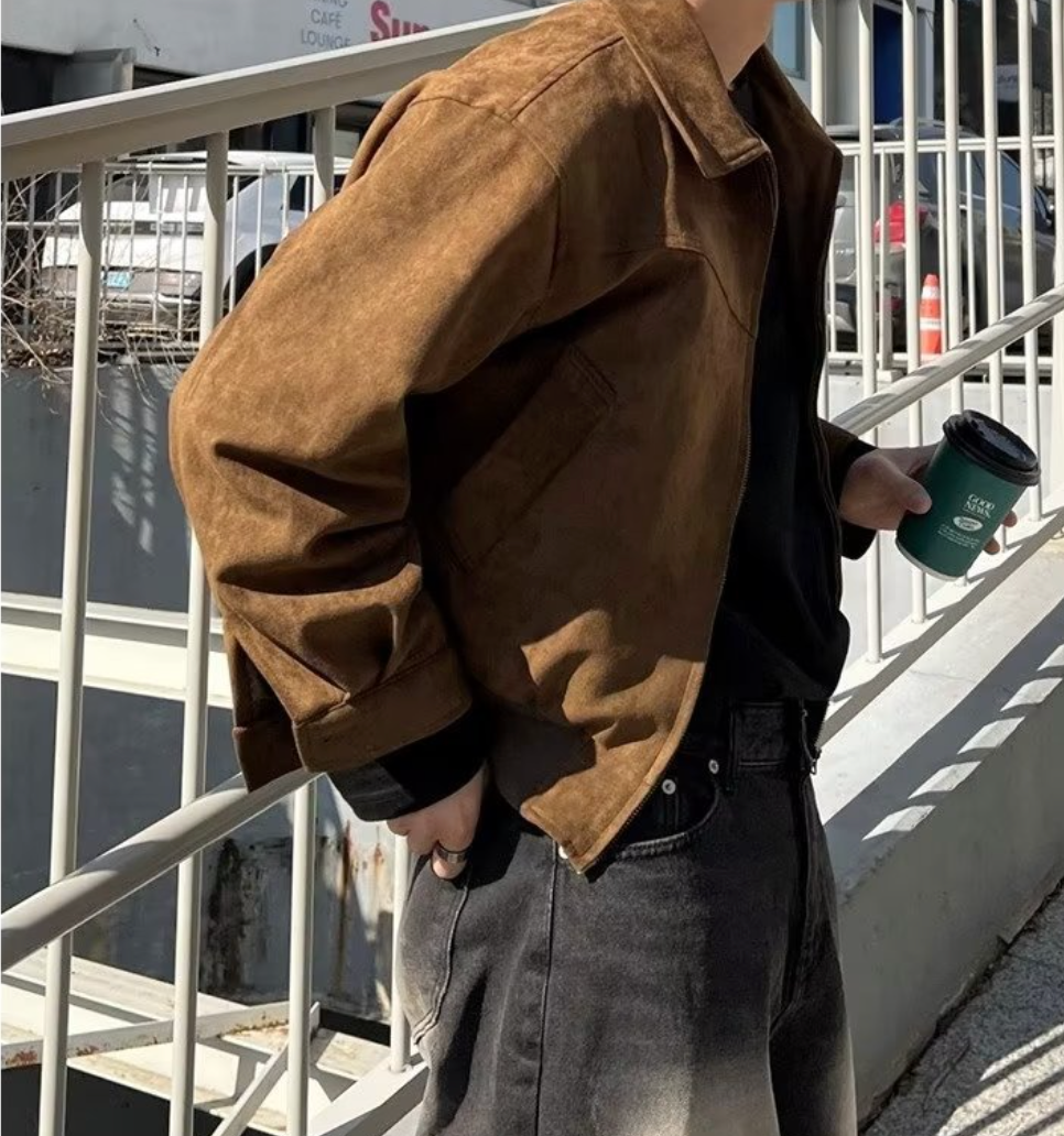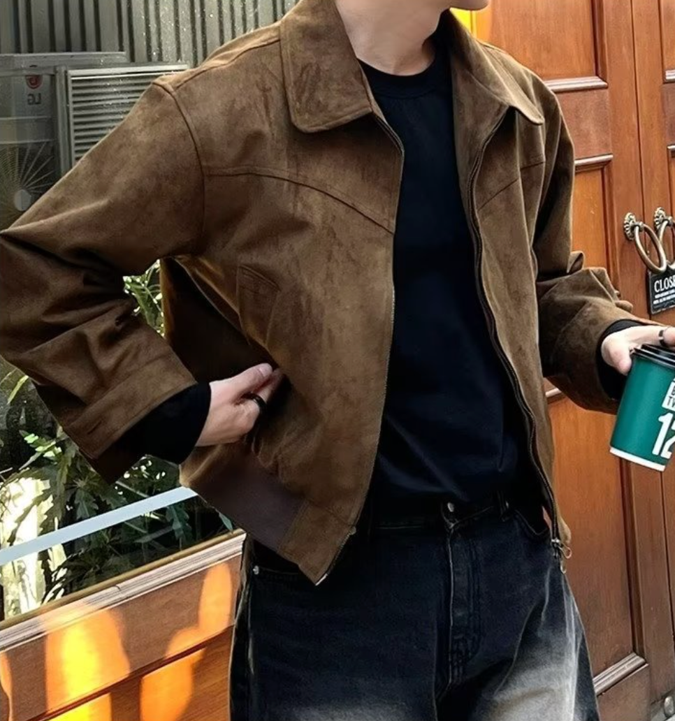 Chaqueta vintage de ante para hombre confeccionada en mezcla de poliéster. Su exterior de cuero es suave y cómodo durante todo el día. Tiene cierre de cremallera, corte holgado, dos bolsillos laterales. Su diseño retro y sólido irradia un encanto masculino maduro.